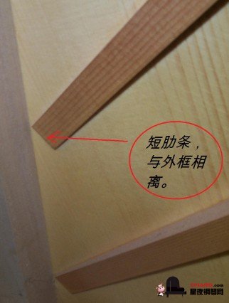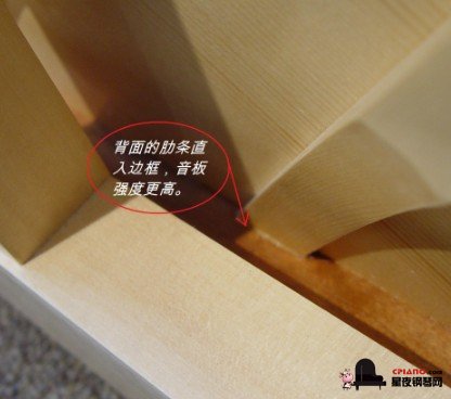 5,音板背后的肋條,能增強音板的強度,高質(zhì)量的鋼琴會用全尺寸的肋條,并且兩端會嵌進外框里頭,低質(zhì)量的鋼琴的肋條一般會跟外框離1英寸左右或者更短。立式琴在琴后背部察看,臥式琴在琴底下察看。